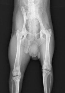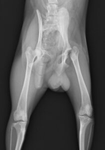 1歳未満の小型犬に多い病気です。成長期に大腿骨頭の血流が悪くなり壊死してしまう病気で、骨が変形して関節炎を起こします。これによって痛みが生じ、悪い方の後肢を上げがちになり、症状が進むと腿の筋肉が萎縮して3本足で歩行するようになります。痛みや跛行のあるものでは手術による早期治療が回復を早めるために重要です。当院では他院からのご紹介などもあり、この手術はとても多く、特にトイプードルが多いです。今回の子は術前の廃用性筋萎縮が強かったため回復に時間がかかりましたが無事元気に走れるようになりました。良かったね。