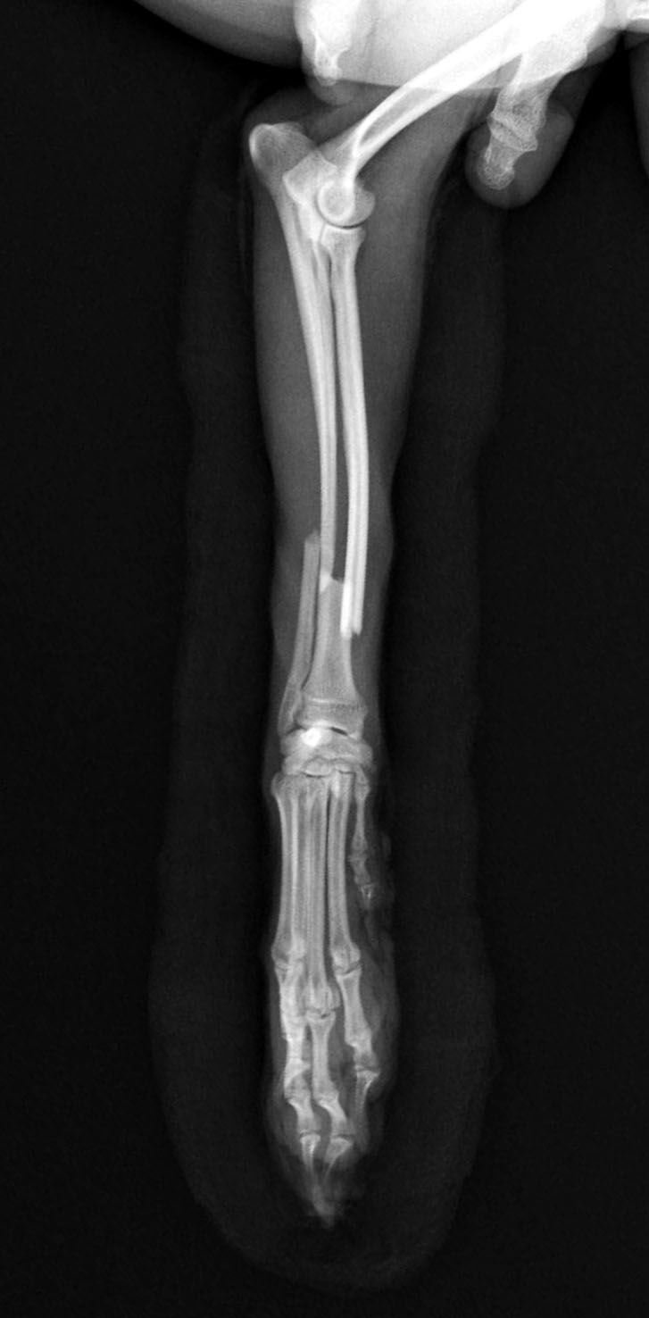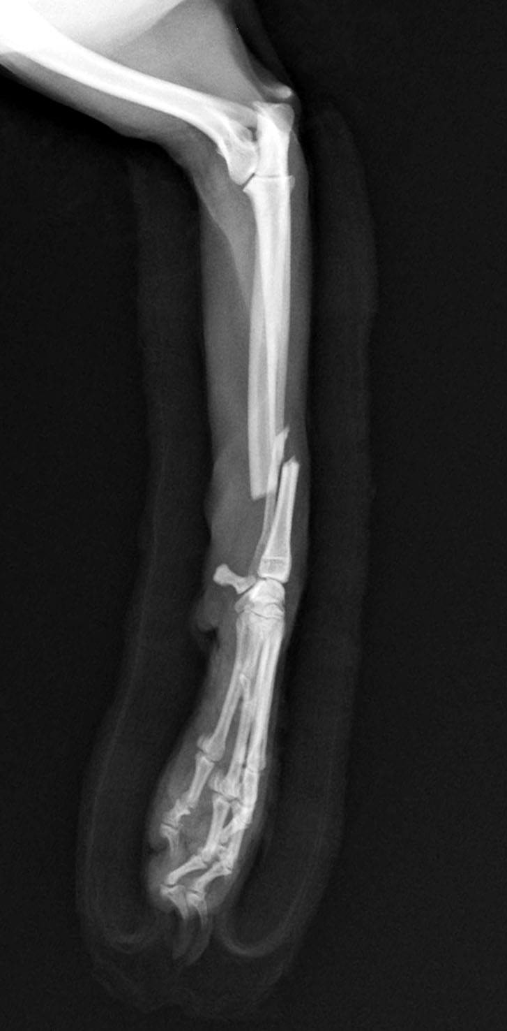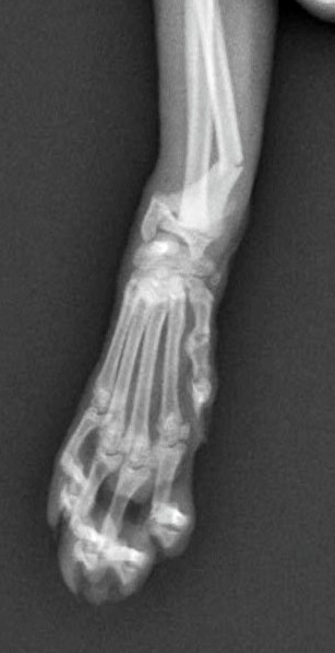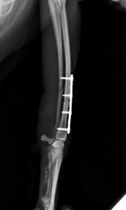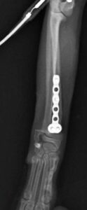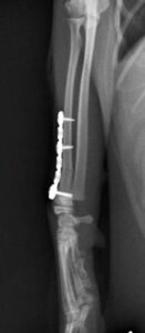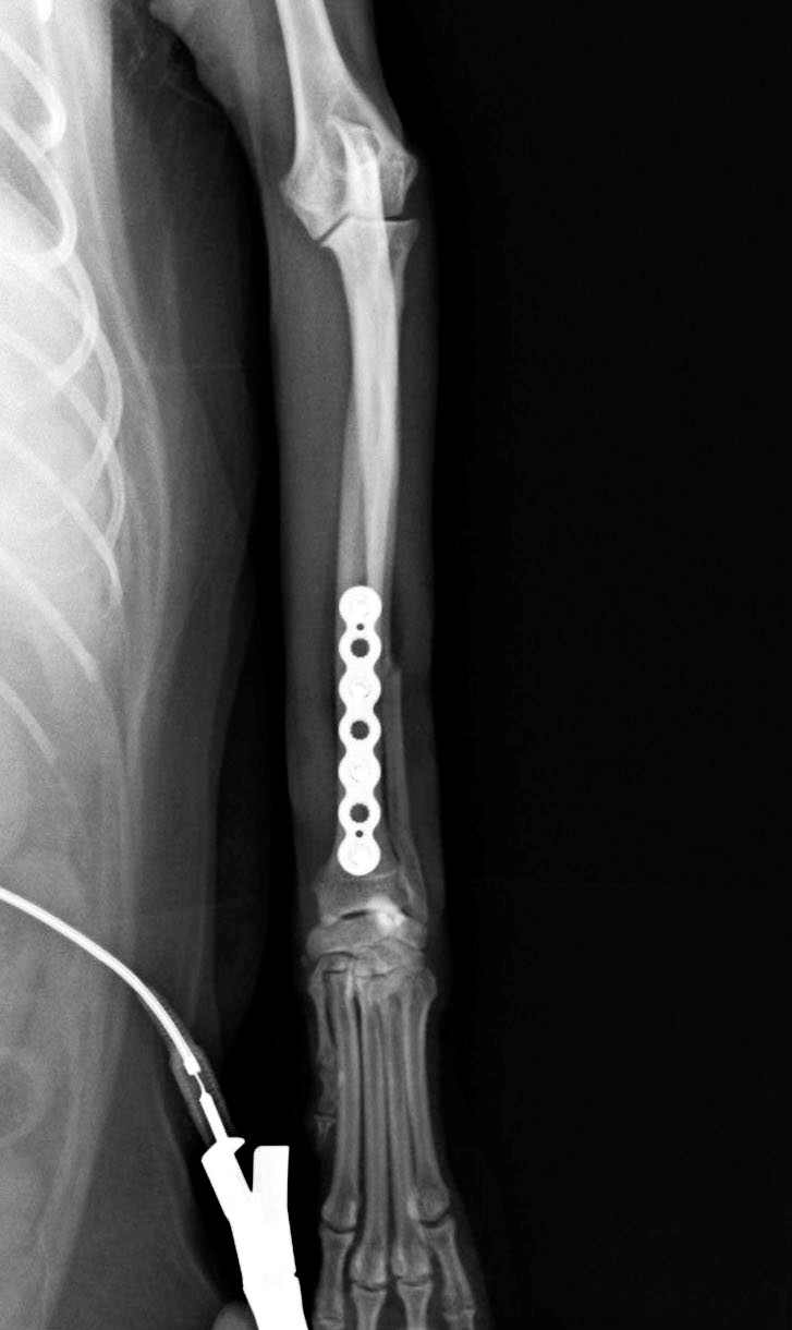 左前腕骨折のトイプードルちゃんです。橈尺骨骨折は動物病院では一番よくある骨折です。ロッキングプレートであるPAX2.0で対応しました。治りも順調で元気に帰りました。よかったね。