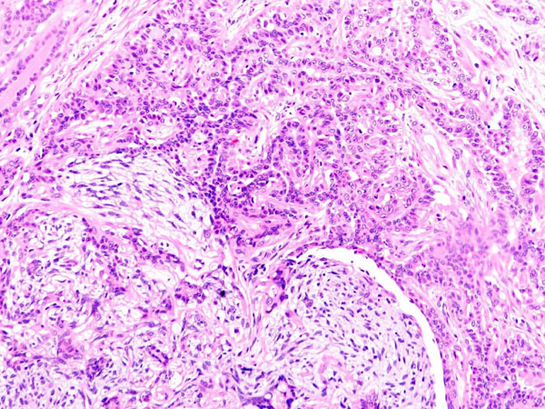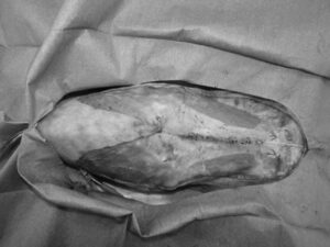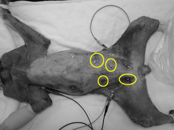 ワンちゃんが乳腺にできた複数のシコリを気にされて来院されました。bilateral mastectomyで対応しました。摘出後の病理組織検査の結果は、「右側第4乳腺および左側第3、4乳腺:乳腺腺腫(複合型)、右側第3乳腺:乳腺小葉性過形成」でした。無事元気に退院し、その後再発もなく経過は良好です。よかったね。