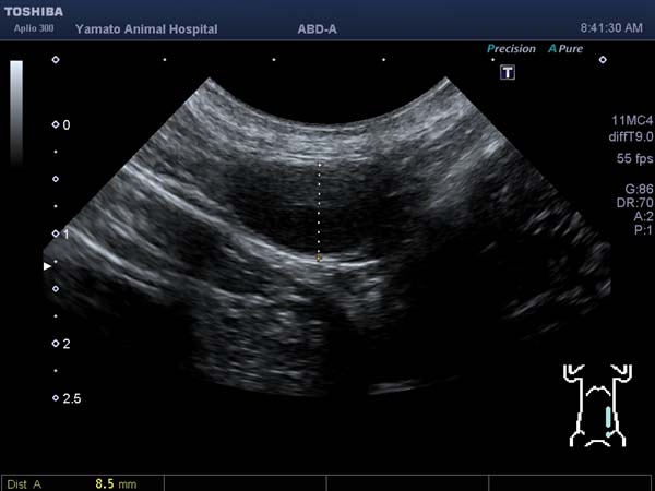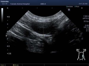 精巣が陰嚢に到達せず、お腹の中や内股の皮膚の下に停留してしまった状態をこう呼びます。犬で多く認められる疾患ですが、過去にもアップしてありますが、ネコでも年間数件手術します。潜在精巣では腫瘍の発生率が高いことから早期の去勢手術が推奨されます。今回の子は鼡径部皮下にエコーで確認でき、手術翌日無事退院していきました。よかったね。