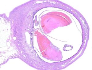 陰部からの出血を繰り返し、元気食欲がないとのことで来院されました。エコー検査にて子宮に腫瘤を認め、手術にて摘出しました。病理組織検査の結果は「顕著な血管拡張および血栓形成を伴う子宮内膜過形成」でした。「子宮においては血栓形成を伴った過形成性の病変が認められました。過形成による血流阻害が一因として考えられます。卵巣においては腫瘍性の変化は認めませんでした。」とのコメントでした。翌日元気に退院されました。「ウサギさんが10歳まで長生きしたらほぼ100%近く子宮の病気になる」という説があります。飼育下のウサギさんが長生きするためには早期の避妊手術が必要であると考えられます。