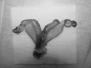 陰部からの出血を繰り返し、元気食欲がないとのことで来院されました。エコー検査にて子宮に腫瘤を認め、手術にて摘出しました。病理組織検査の結果は「顕著な血管拡張および血栓形成を伴う子宮内膜過形成」でした。「子宮においては血栓形成を伴った過形成性の病変が認められました。過形成による血流阻害が一因として考えられます。卵巣においては腫瘍性の変化は認めませんでした。」とのコメントでした。翌日元気に退院されました。「ウサギさんが10歳まで長生きしたらほぼ100%近く子宮の病気になる」という説があります。飼育下のウサギさんが長生きするためには早期の避妊手術が必要であると考えられます。