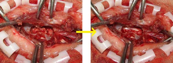 手術の様子です。骨髄移植も併用しました。順調に回復し元気に歩けるようになり、ご紹介元の先生にお返しできました。良かったです。