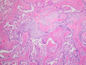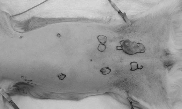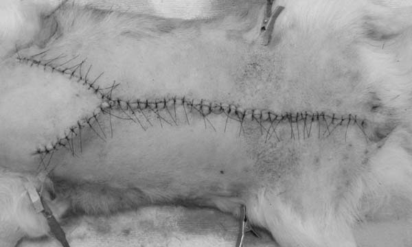 ワンちゃんが乳腺にできた複数のシコリを気にされて来院されました。bilateral mastectomyで対応しました。摘出後の病理組織検査の結果は、「右第4乳腺部:乳腺腺腫内腺癌」「左第4乳腺部:複合型乳腺癌」でそれ以外は「乳腺腺腫」でした。無事元気に退院し、その後再発もなく経過は良好です。よかったね。