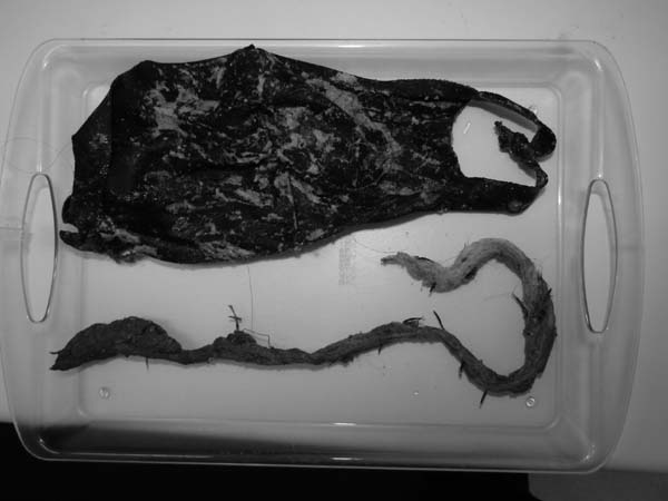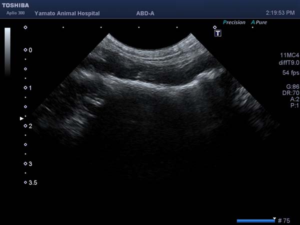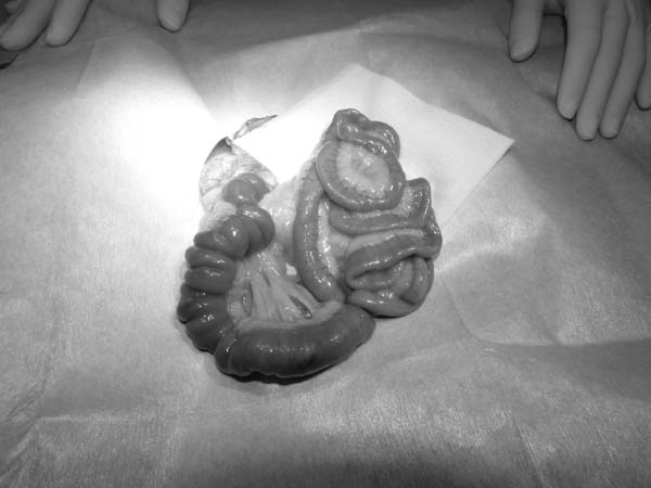 ひも状の異物を飲み込んだワンちゃんが腸閉塞の症状で来院されました。超音波検査では小腸の遠位にひも状異物による閉塞症状が確認されました。開腹すると空腸に異物が確認されました。指で優しく逆行性に胃まで異物を押し戻し内視鏡にて摘出しました。この方法では胃を通り過ぎてしまった異物でも、異物の形状によっては消化管切開をせずに取り出せますので、術後の回復も早く動物にやさしい手術となります。今回のワンちゃんも早期に元気に退院できました。良かったね。