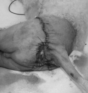 5~6歳以上の去勢手術をしていないオス犬に多い病気ですが、メス犬や去勢した犬に起こることもあります。お尻の筋肉が萎縮した結果、筋肉の隙間から直腸や膀胱が皮膚の下にとびでてしまいます。これにより便が出にくくなったり膀胱炎になったりします。手術をすることで機能回復および今後の致死的な状況を回避することができます。当院では去勢手術→結腸固定→前立腺固定→骨盤隔膜構成筋の縫縮→内閉鎖筋フラップ→浅臀筋フラップの順で通常腹側・臀部左右両側同時に行います。また老化以外に、筋肉が萎縮する原因があったり、腹圧がかかる原因があったりする場合も多いので、再発防止のためそれらの診断・治療も重要です。今回のワンちゃんも無事手術も終わり元気に退院しました。よかったね。