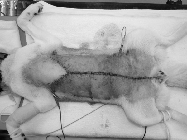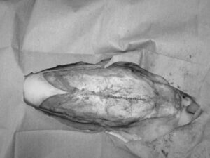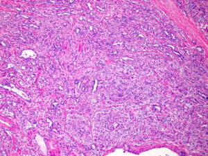 ワンちゃんが乳腺にできた複数のシコリを気にされて来院されました。bilateral mastectomyで対応しました。摘出後の病理組織検査の結果は、「右第5および左第5乳腺:乳腺腺腫(複合型)、左第3乳腺:乳腺腺腫(単純型)、左右リンパ節:反応性過形成」でした。無事元気に退院し、その後再発もなく経過は良好です。よかったね。