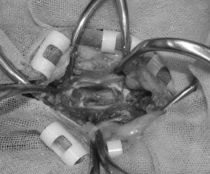 手術の様子です。骨髄移植も併用しました。順調に回復し元気に歩けるようになり、ご紹介元の先生にお返しできました。良かったです。