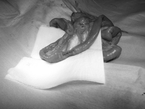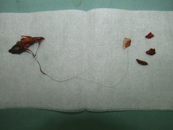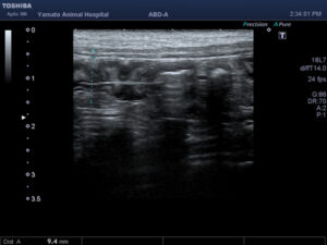 吐き気が続いて、元気・食欲がないワンちゃんが来院されました。超音波検査で異物による小腸閉塞、特にひも状異物が画像から疑われましたので緊急手術となりました。腸を切開し異物を摘出し、無事手術は終了、元気に退院していきました。よかったね。