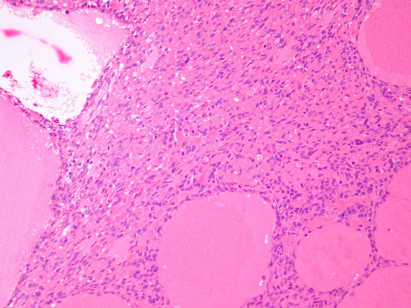 大型犬の子が上腕骨の悪性腫瘍の断脚手術希望でご紹介がありました。切除後の病理組織検査の結果は悪性の「骨肉腫」でした。付属のリンパ節に上記腫瘍の転移は認められませんでした。観察範囲において腫瘍は切除されていますが、今後も再発に注意が必要です。その後、ご紹介元の先生の所での治療となりました。